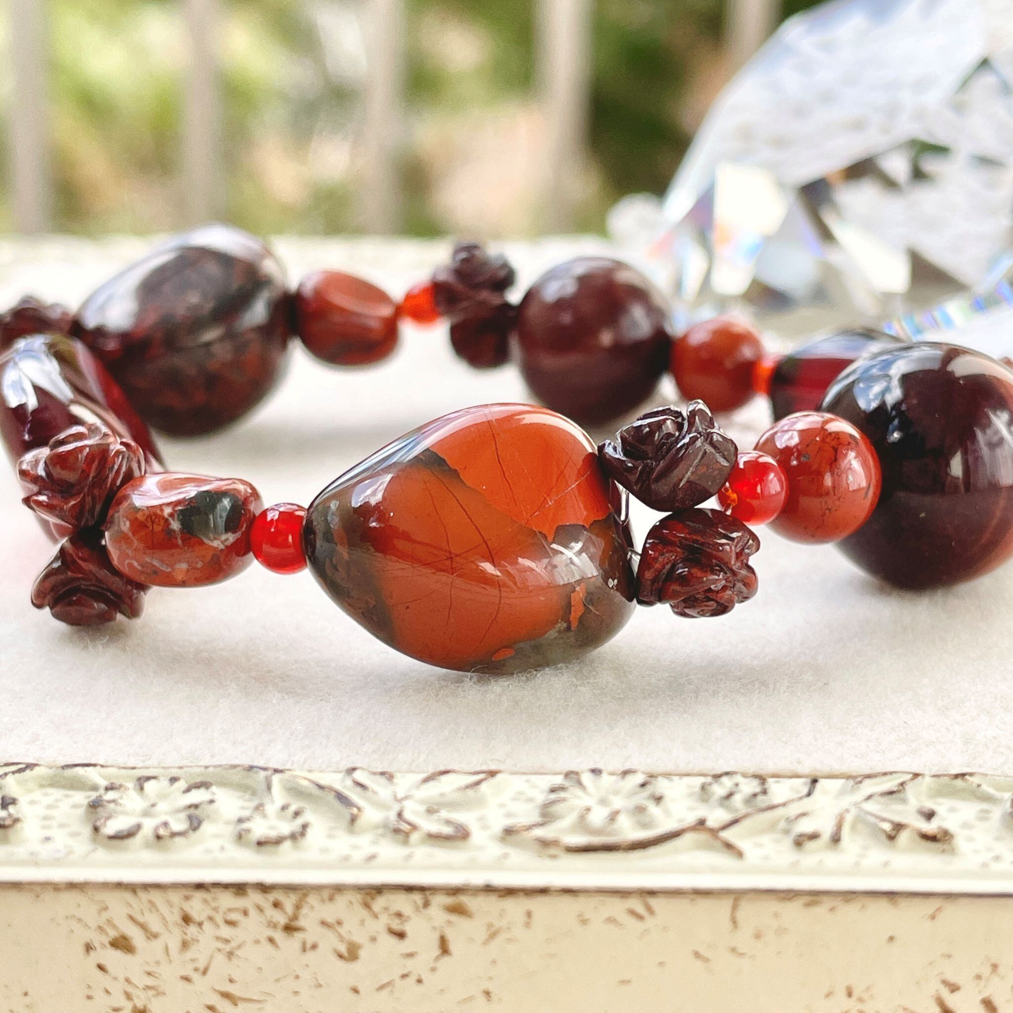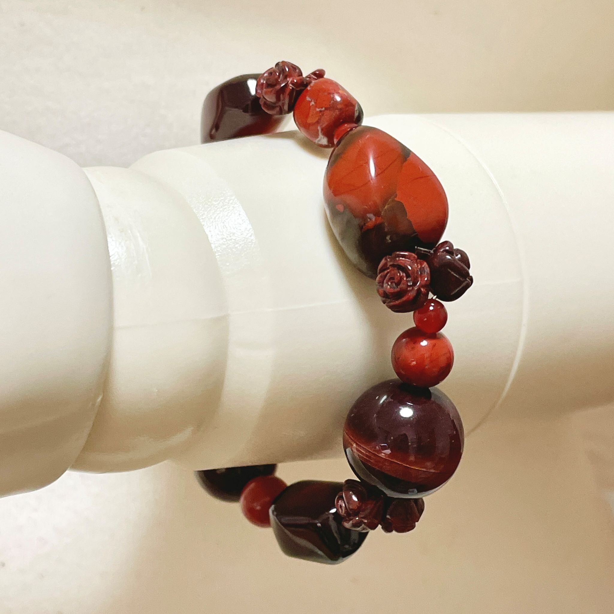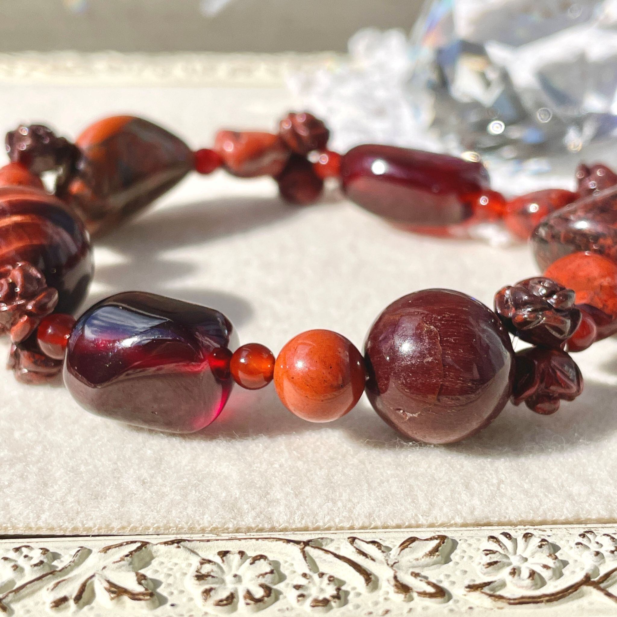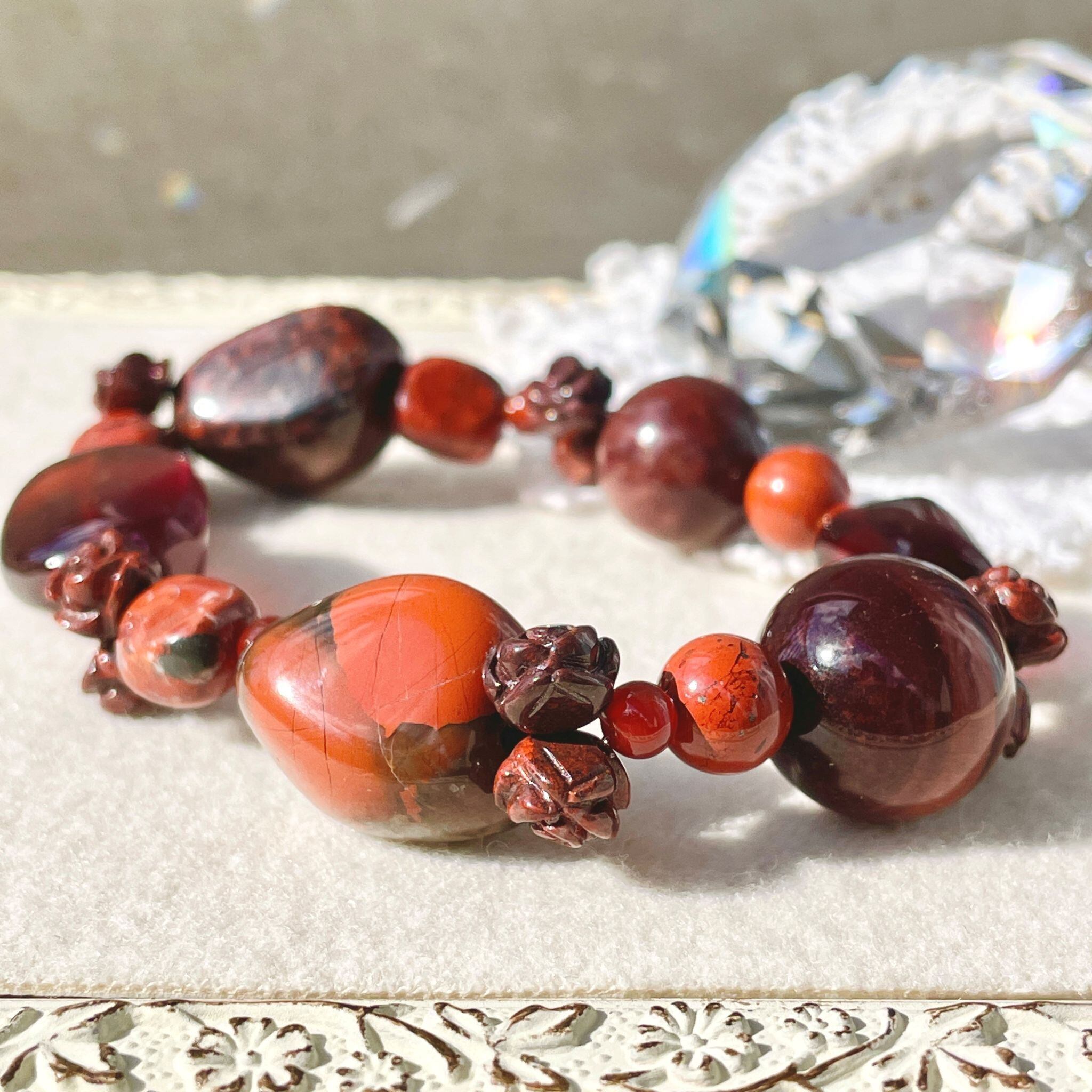 赤のジャスパーを中心に構成した、それぞれの形状も楽しいブレスレットです。