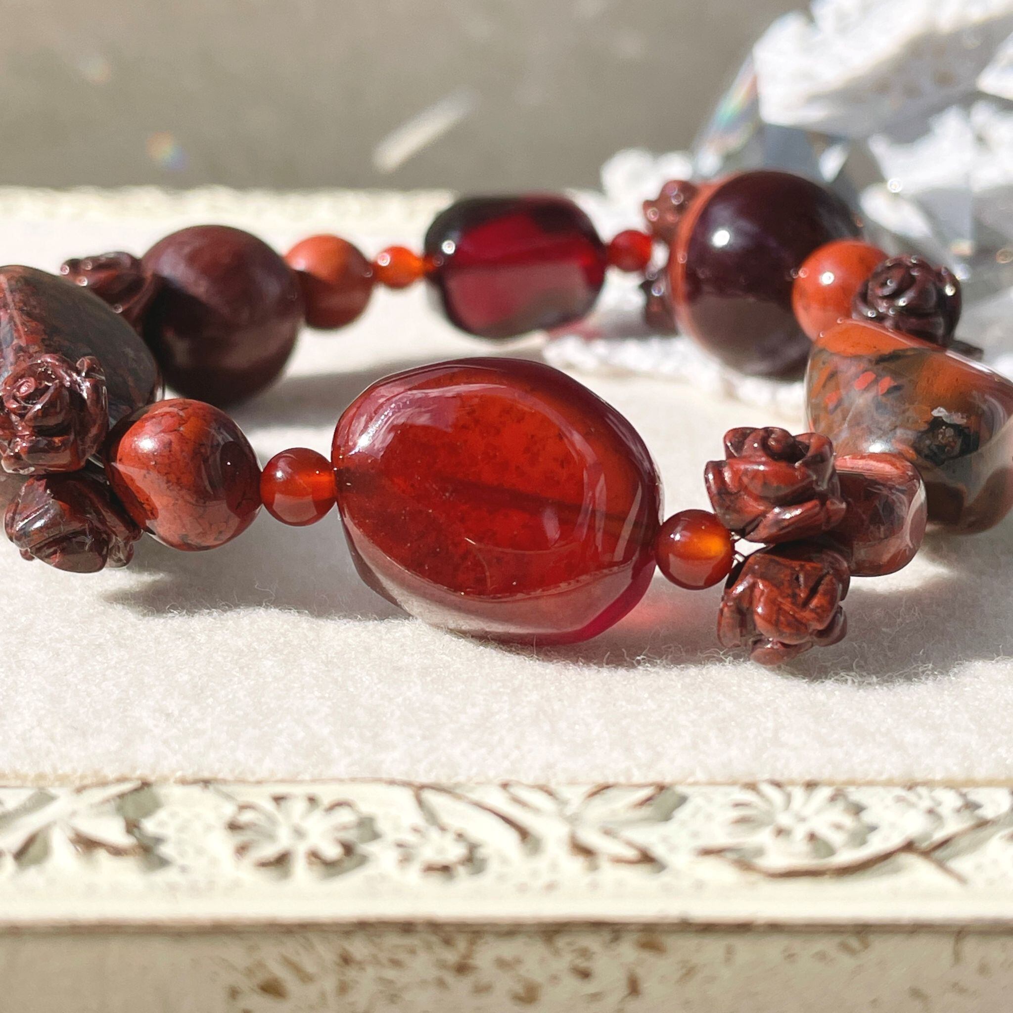 赤い色は血液を連想させます。血は「生」の象徴でもある事から、古くから命を守るお守りとされてきました。また、肉体と精神の両方のエネルギーを活性化させる事から、明るい気持ちで前へ進む手助けをしてくれるそうです。愛と信頼を意味することから、友情の証として、また恋人同士の「一途な愛」の形として身につけたり石を贈り合う習慣があるそうです。