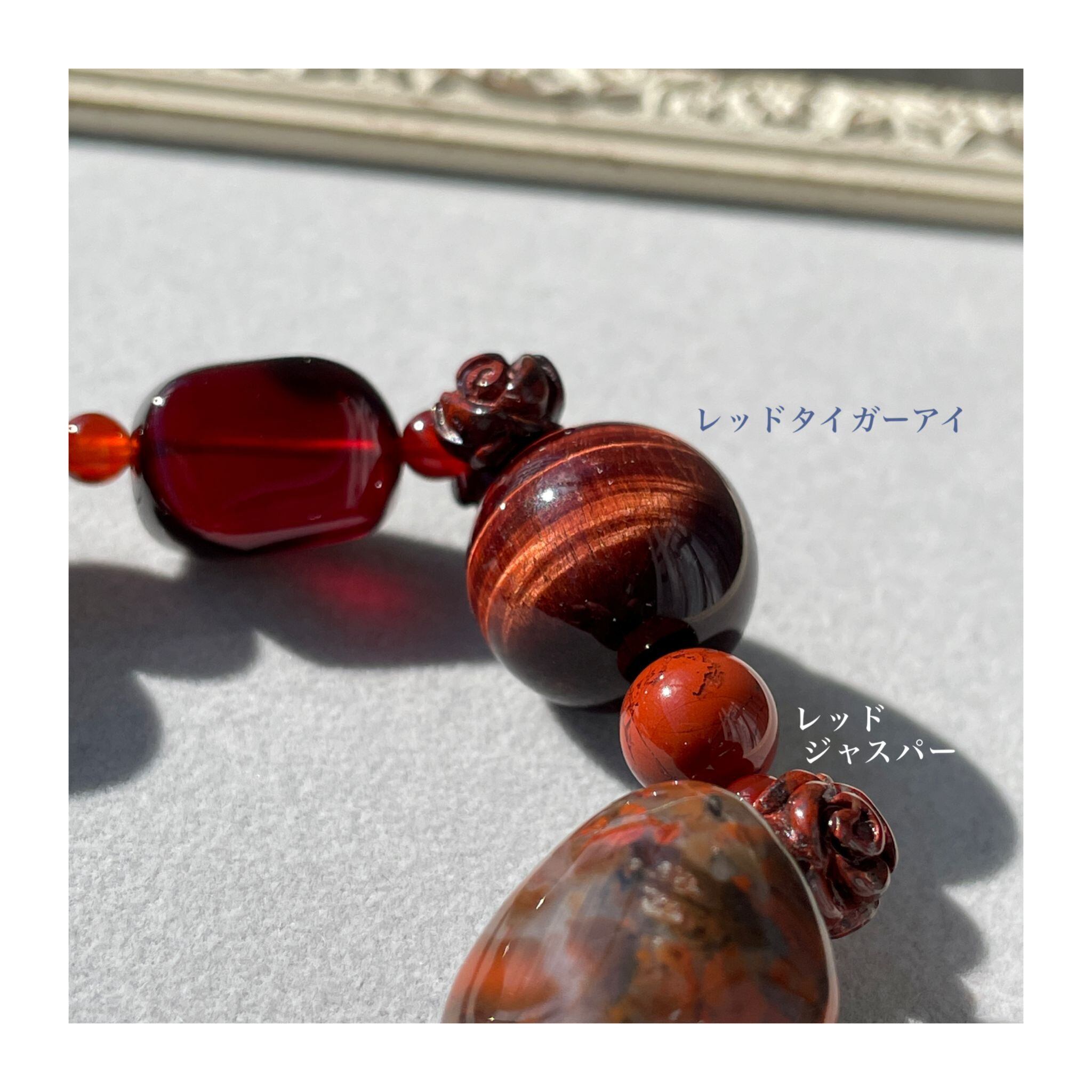 他には、朱赤を引き立たせるために暗赤色の石を合わせています。