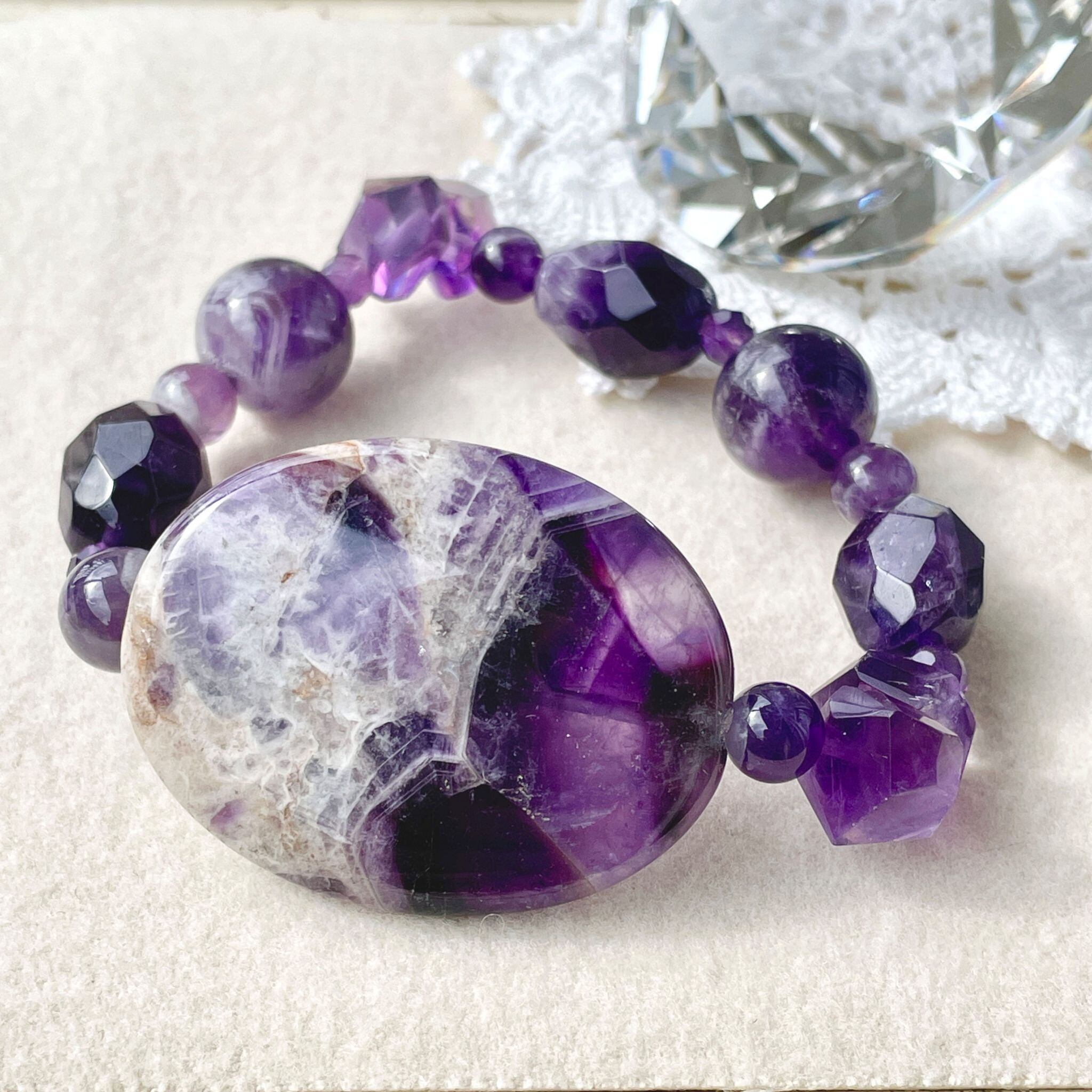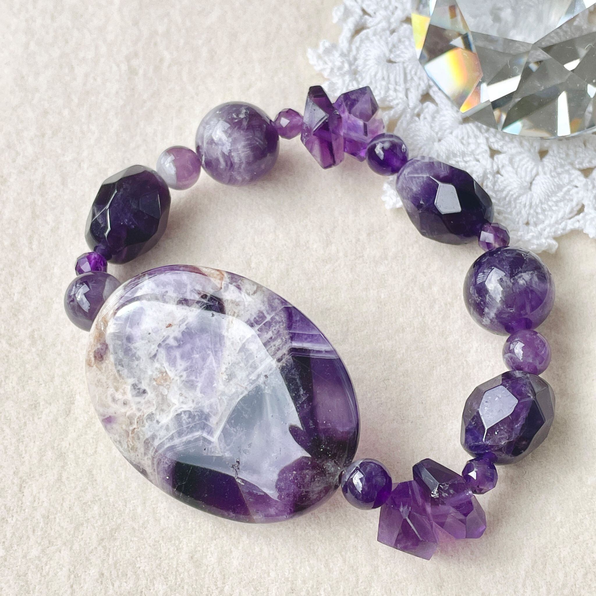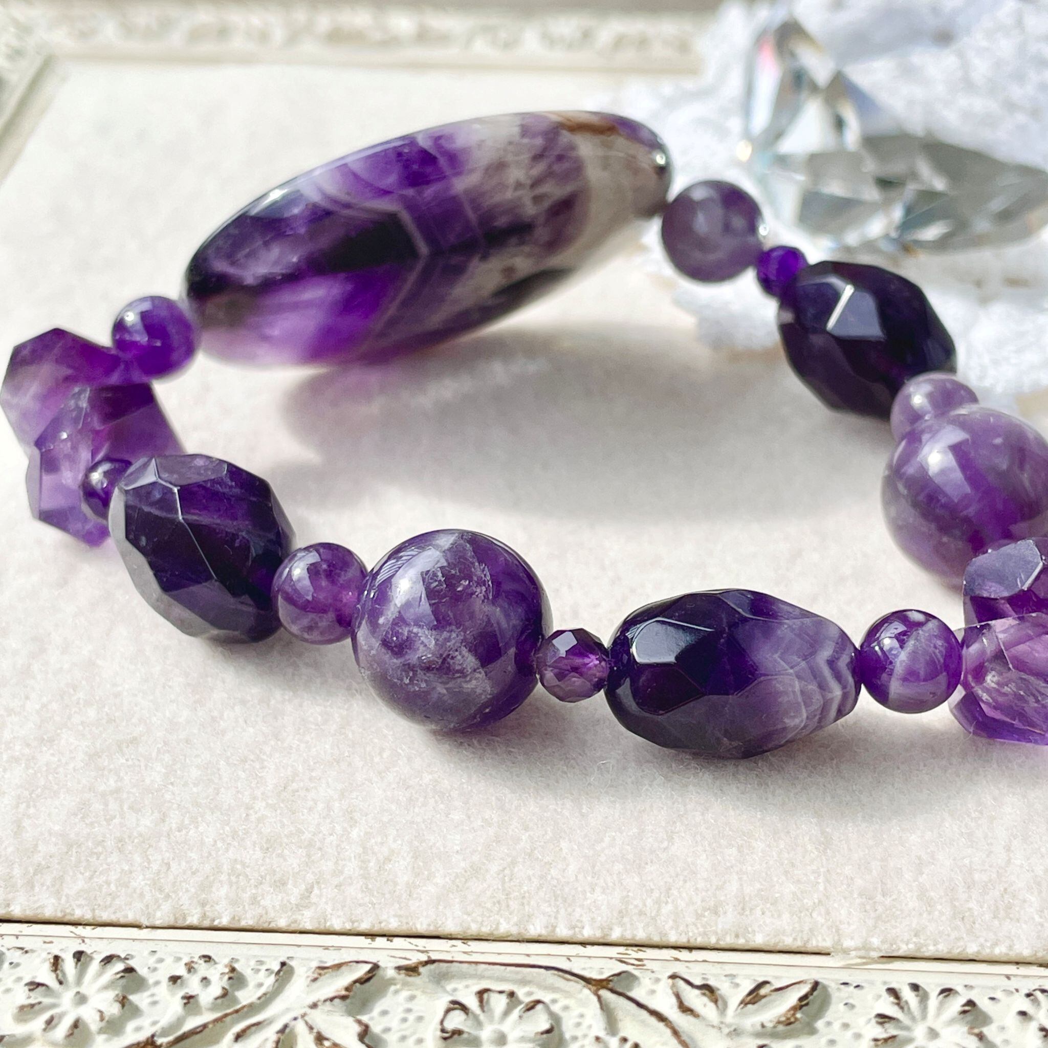 こちらは、深い紫色を活かして構成したブレスレットです。