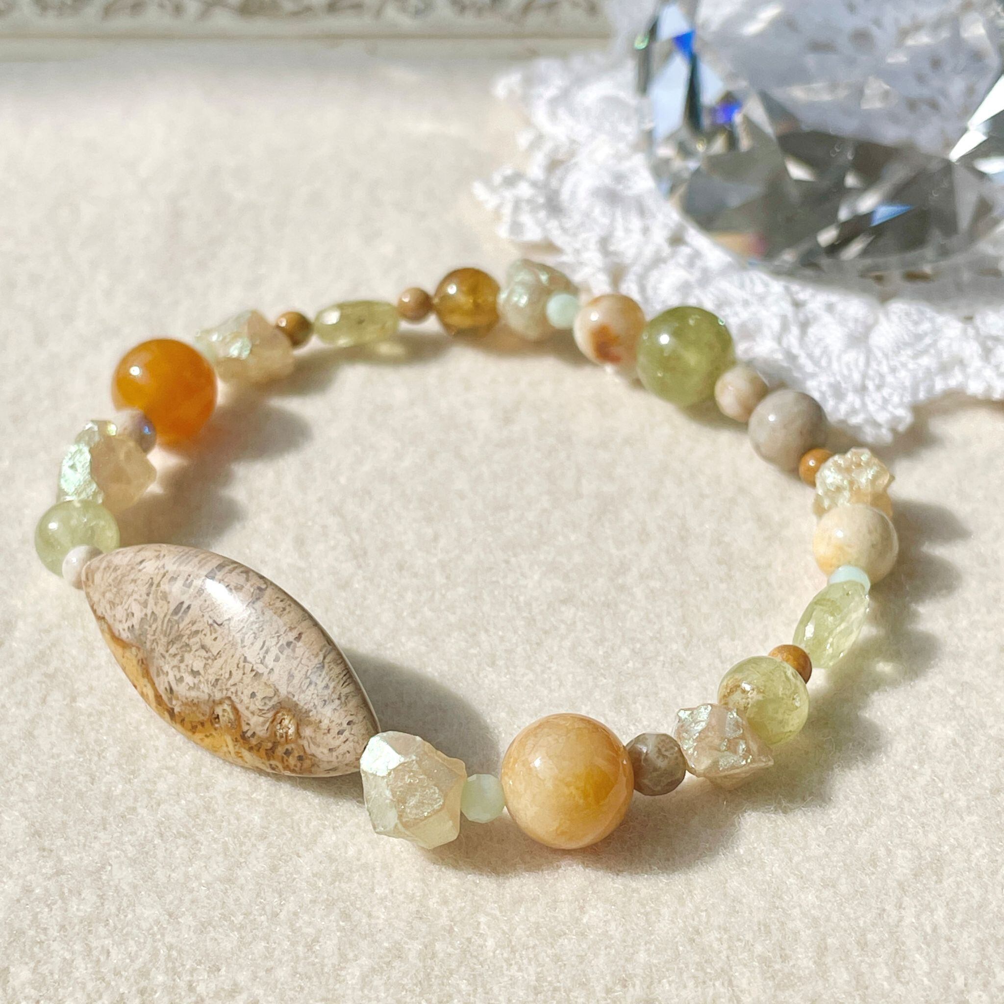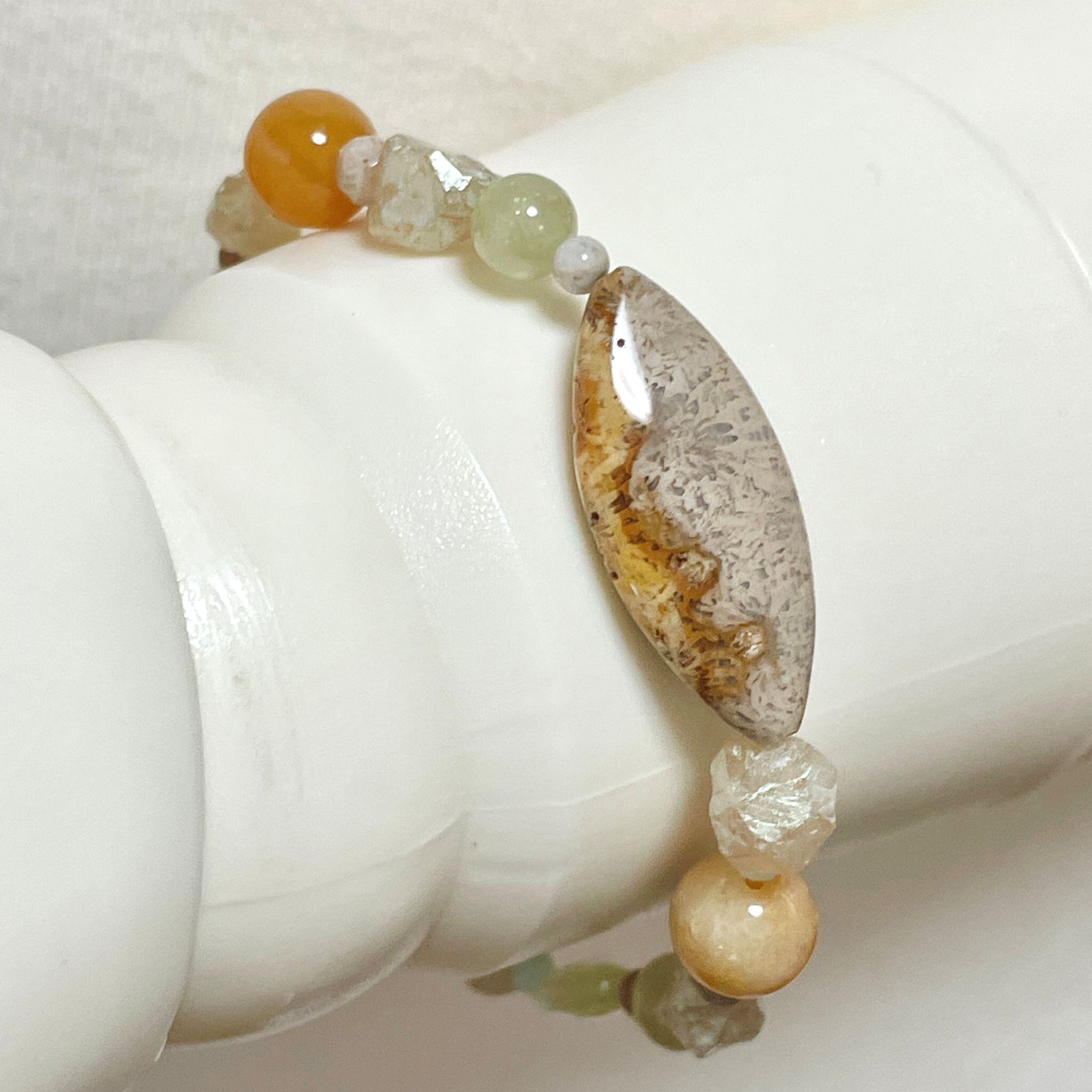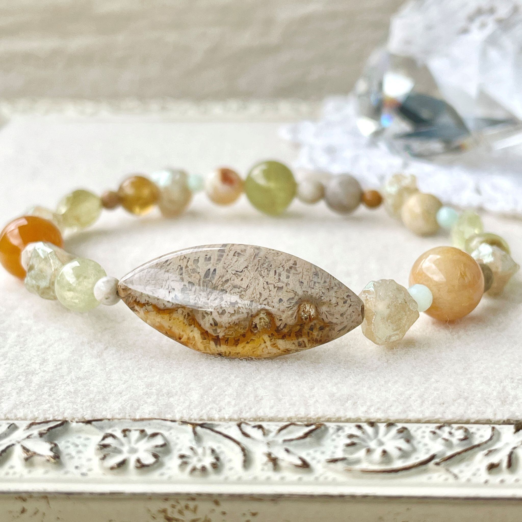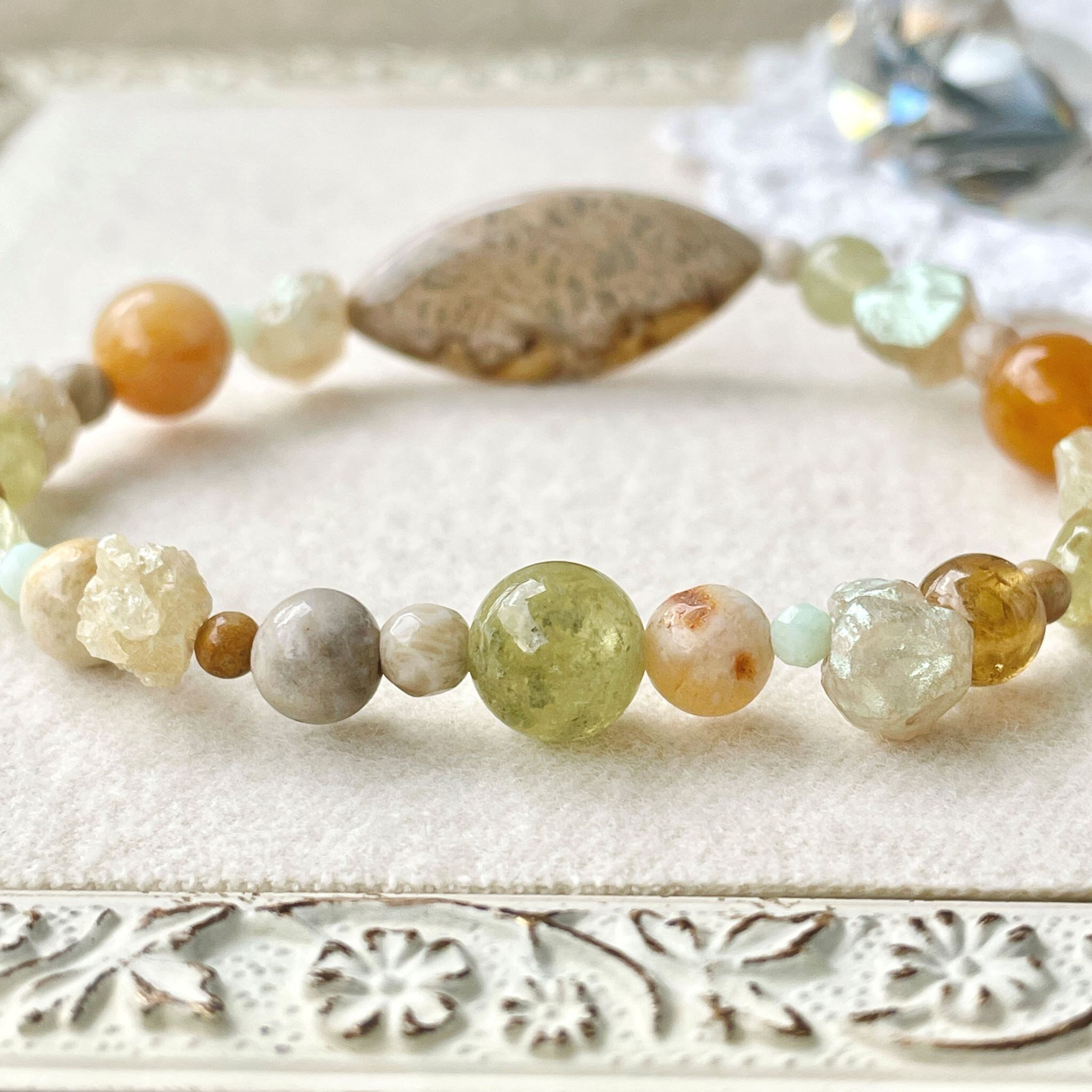 個性的な柄のフォシルコーラル(化石珊瑚)を中心に構成したブレスレットです。