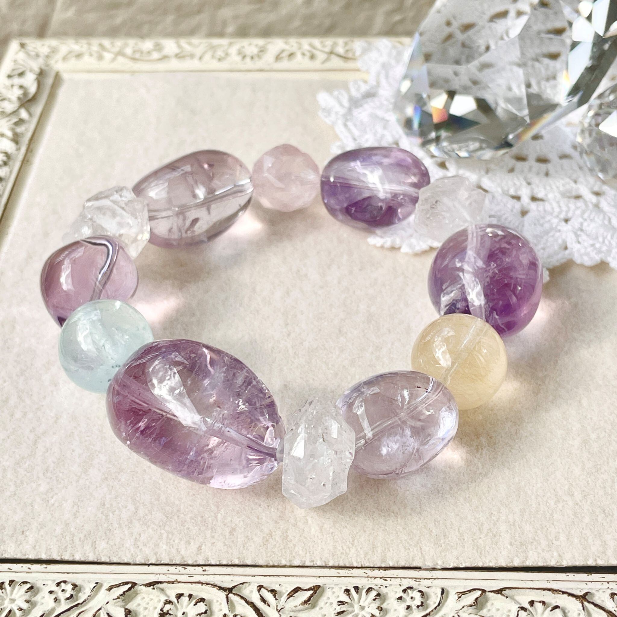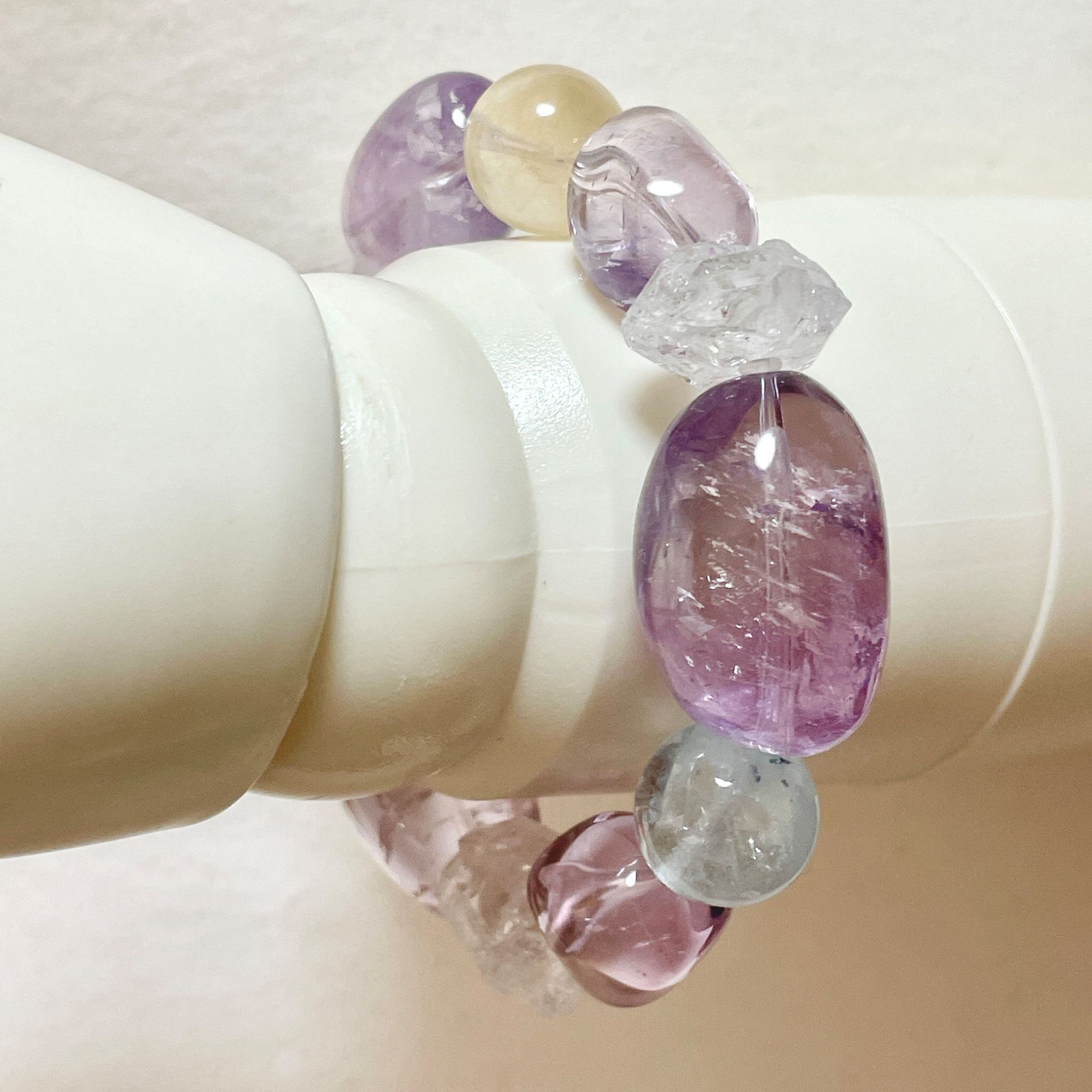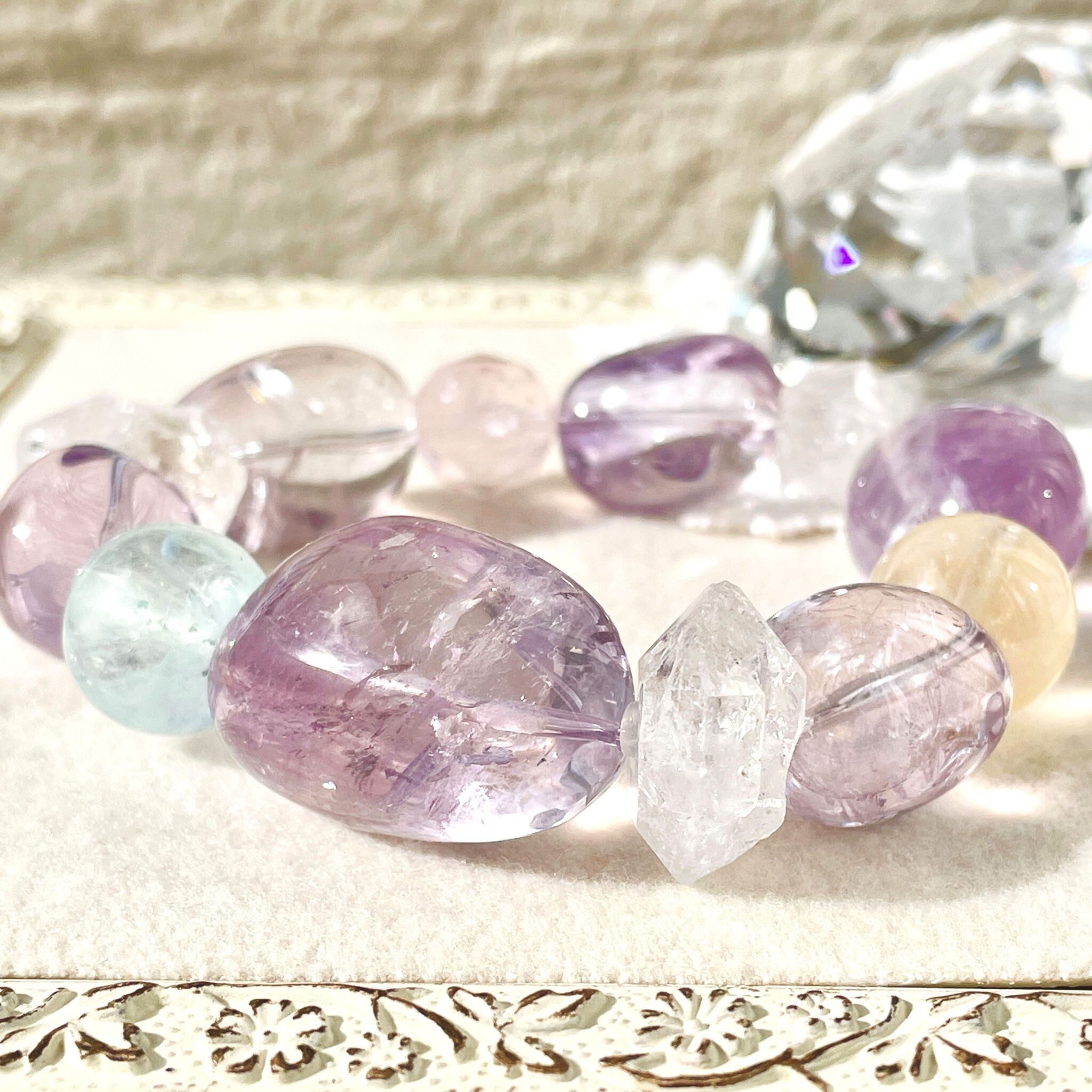 ライトカラーのアメシストを中心に構成した大ぶりなブレスレットです。