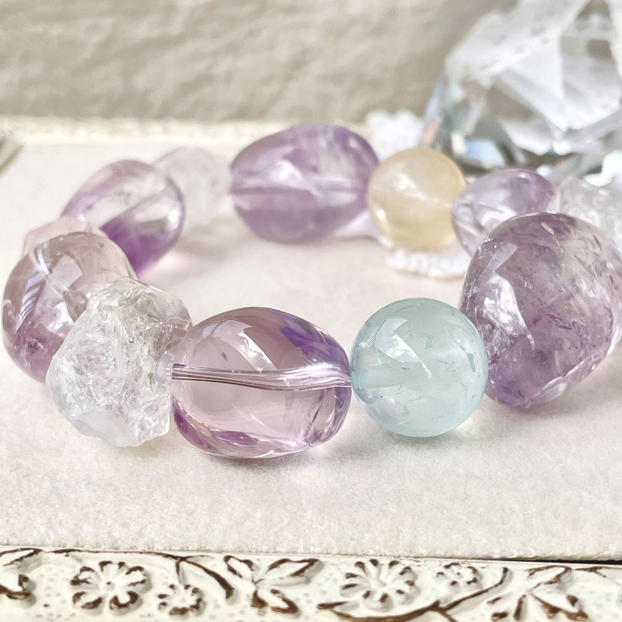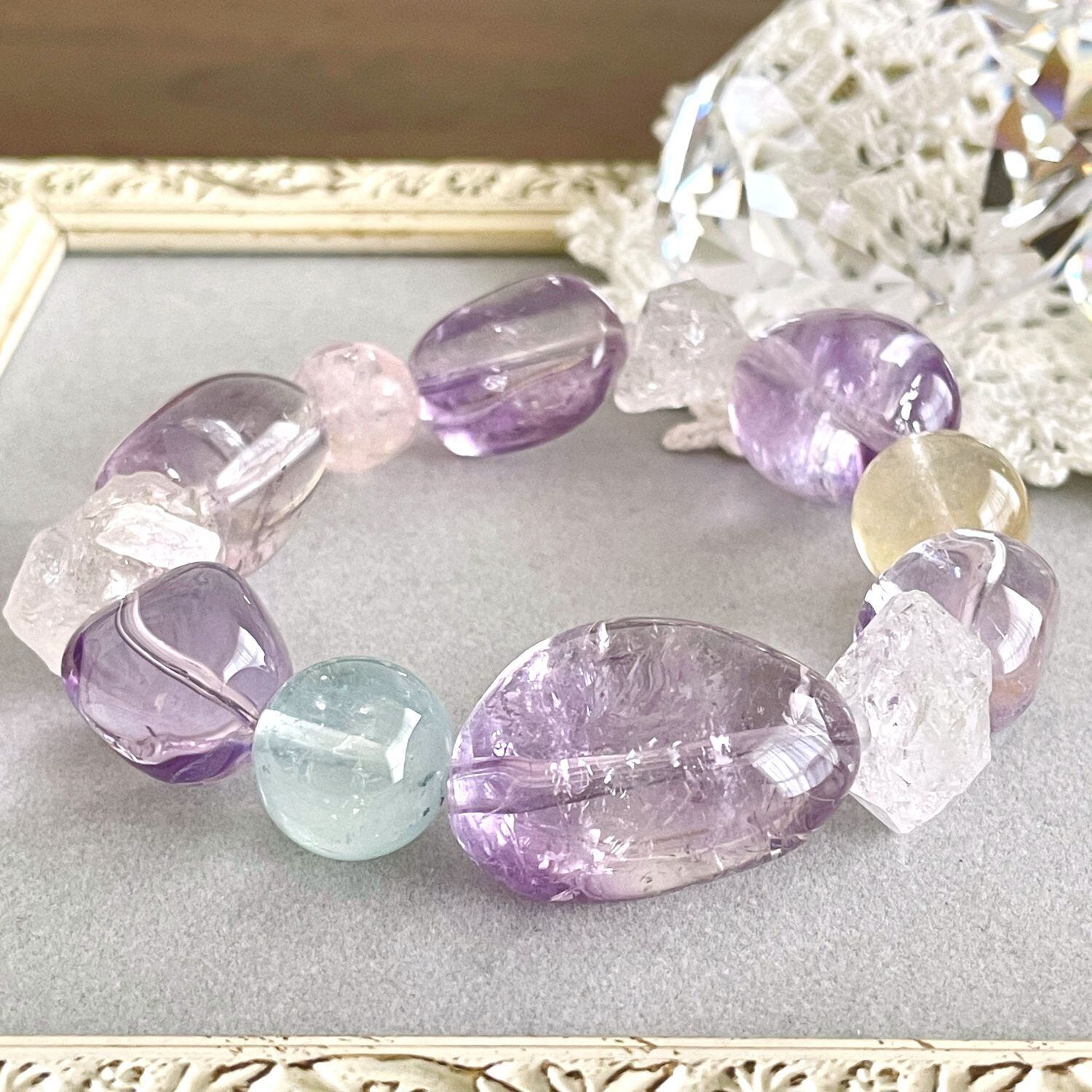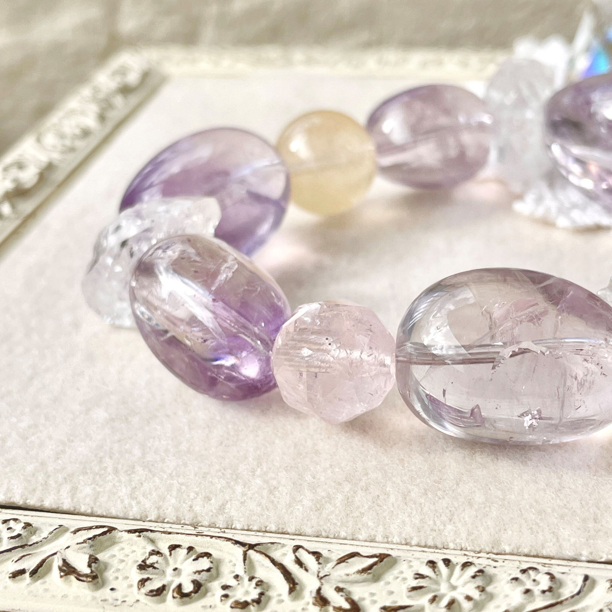 ライトカラーのアメシストを中心に構成した大ぶりなブレスレットです。